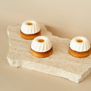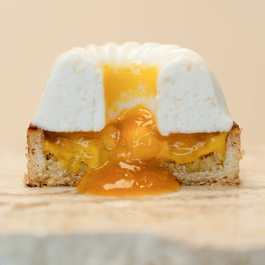 Pâte sucrée, crème noix de coco, gelée passion, crémeux mangue, mousse légère noix de coco.