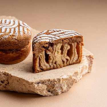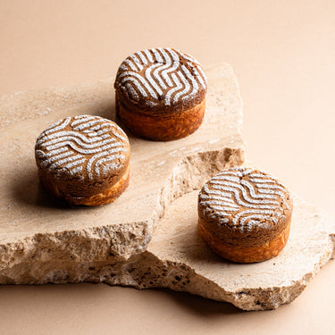 Pâte à croissant, garnie d’un mélange à la cannelle, et surmontée d’un biscuit croquant décoré d’un pochoir géométrique en sucre glace.